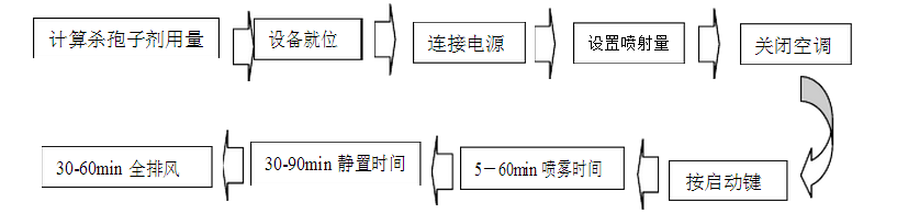 ⑸  性價比極高,不到氣化過氧化氫設備20-30分之一的成本,達到滅菌效果 ⑹  整個消毒過程時間短,所以相比甲醛熏蒸使停產時間大大縮短 滅菌流程